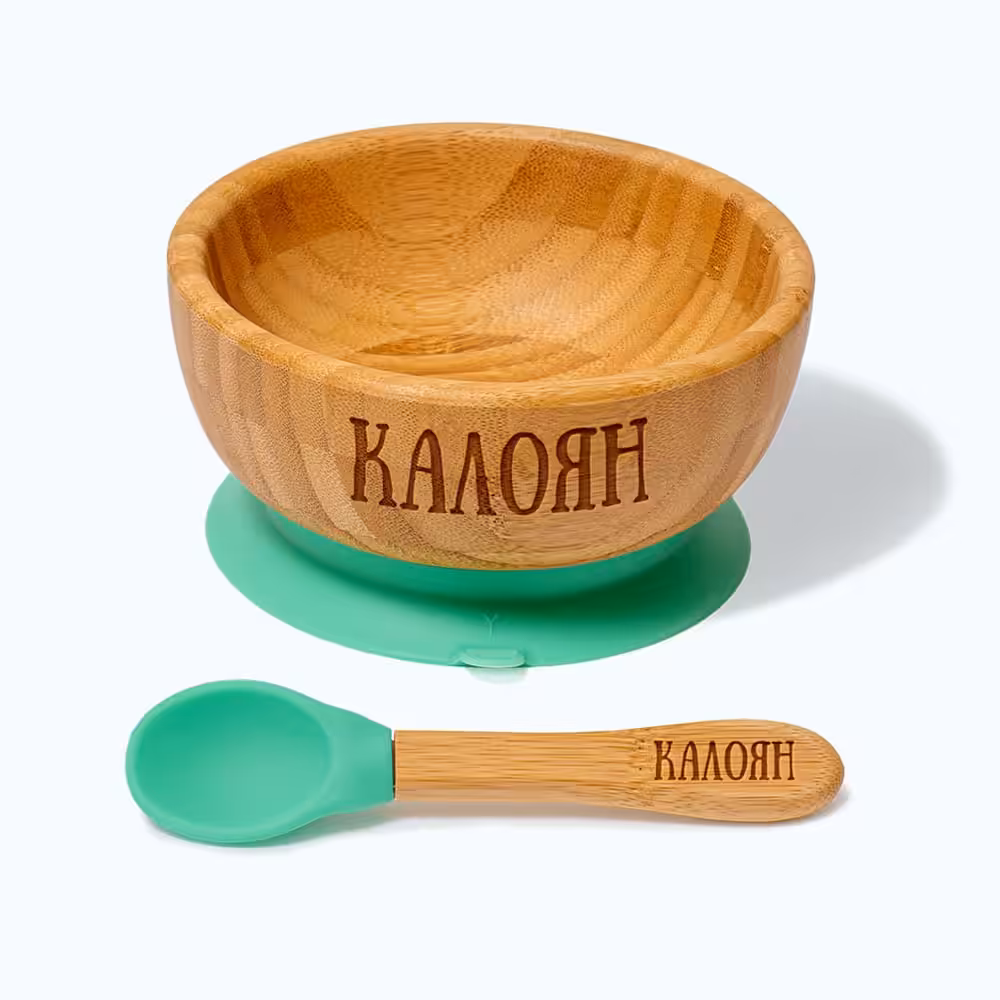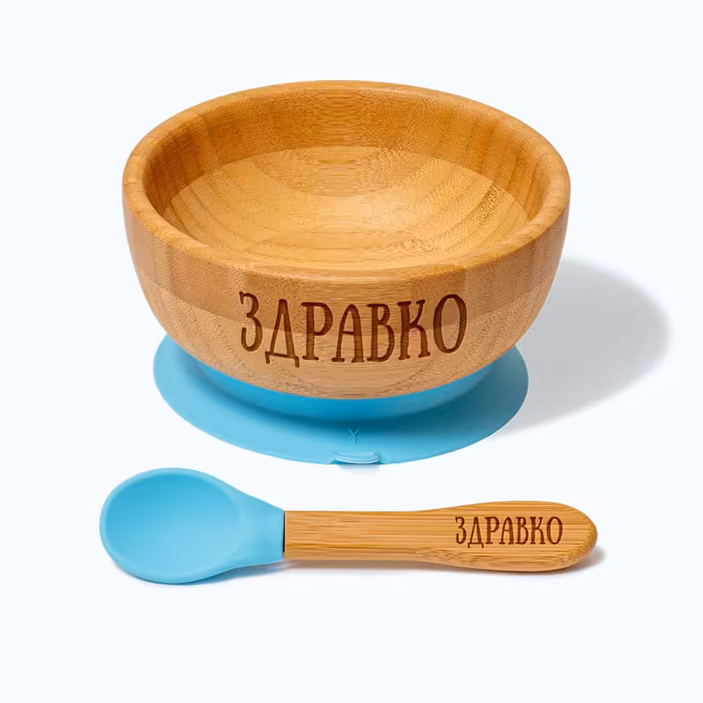 Бамбуковата купичка с лъжичка MyMunche е удобен комплект за бебета и малки деца, който се захваща стабилно за масата.