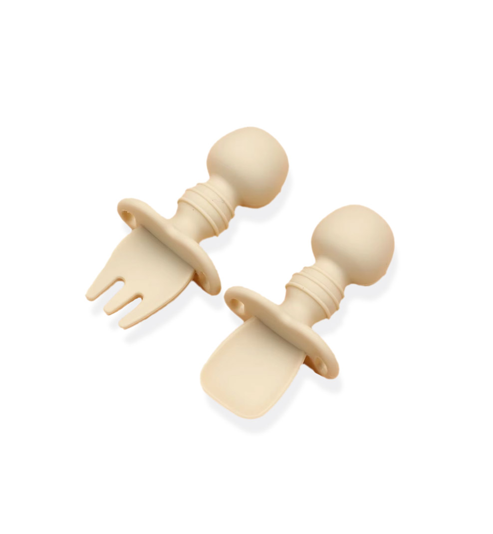 🛡️ Безопасни - хоризонталният предпазител ограничава до къде бебето може да вкара приборите в малката си устичка, без опасност от задавяне, докато практикува нови умения в храненето.