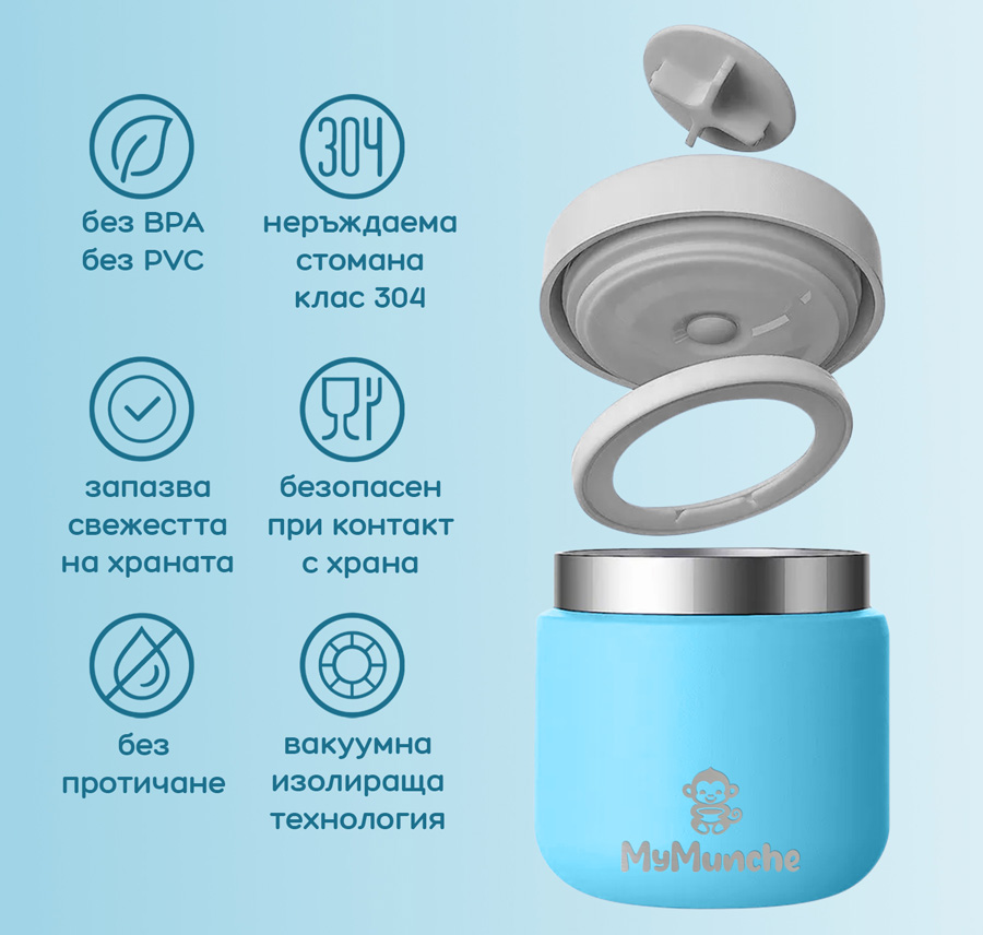 Със своята елегантна и компактна форма термосът за храна MyMunche е лесен за пренасяне в бебешката чанта, в раницата за съхранение на бебешки принадлежности или директно в коша на количката. Побира 360 мл и можете да изберете от 4 жизнерадостни цвята, които отговарят на вашия стил и предпочитания, а се съчетават чудесно и с останалите ни продукти.
