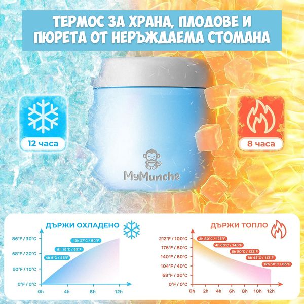 Изработен от устойчива неръждаема стомана (клас 304), този термос ще се превърне в едно от най-полезните допълнения към колекцията ви от бебешки прибори. Неръждаемата стомана от клас 304 е нетоксична и не отделя вредни микрочастици в храната на детето, не допуска и развитието на бактерии, което прави термосът на MyMunche идеален за многократна употреба.