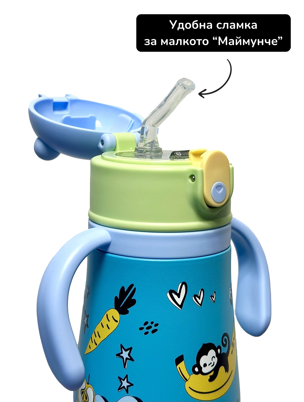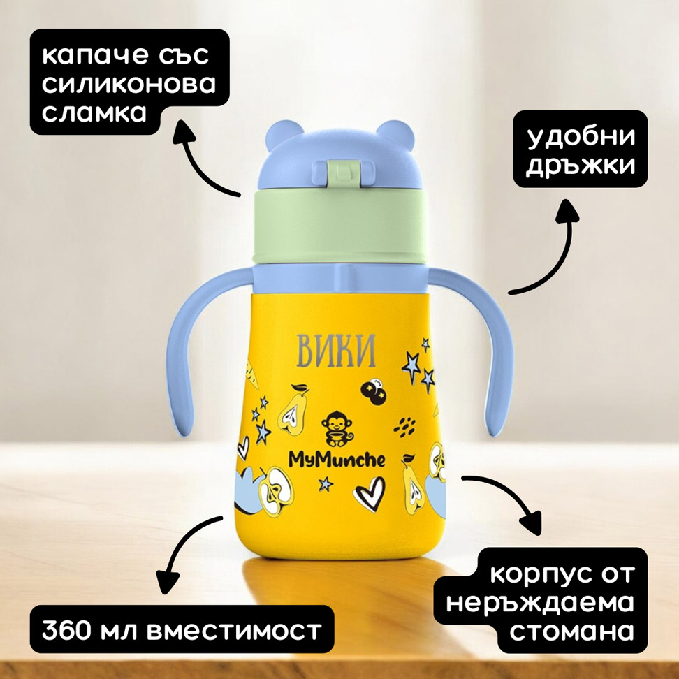 Запознай се с термо бутилката на MyMunche! С ярките си цветове, забавен, но и функционален дизайн, тя ще се превърне във верен спътник в ежедневието на малките откриватели. С нея подръка, всяко дете е готово за игри в парка, за разходка сред природата или за забавления на плажа. Изключително подходяща и за детската градина или за яслата, тъй като гравираме старателно всяка бутилка с името на малкия й притежател (напълно безплатно 🤩). Така тя е лесно и бързо разпознаваема сред останалите в групата.