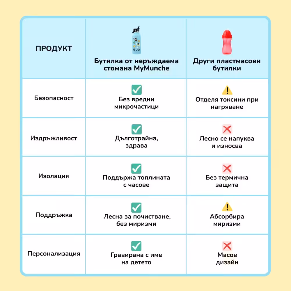 Шишето е от висококачествена неръждаема стомана, тип 304. Капачките са пластмасови, без BPA, BPS, фталати и олово. А сламката на спортната капачка е от т.нар. food-grade силикон, безопасен при контакт с храни/течности.