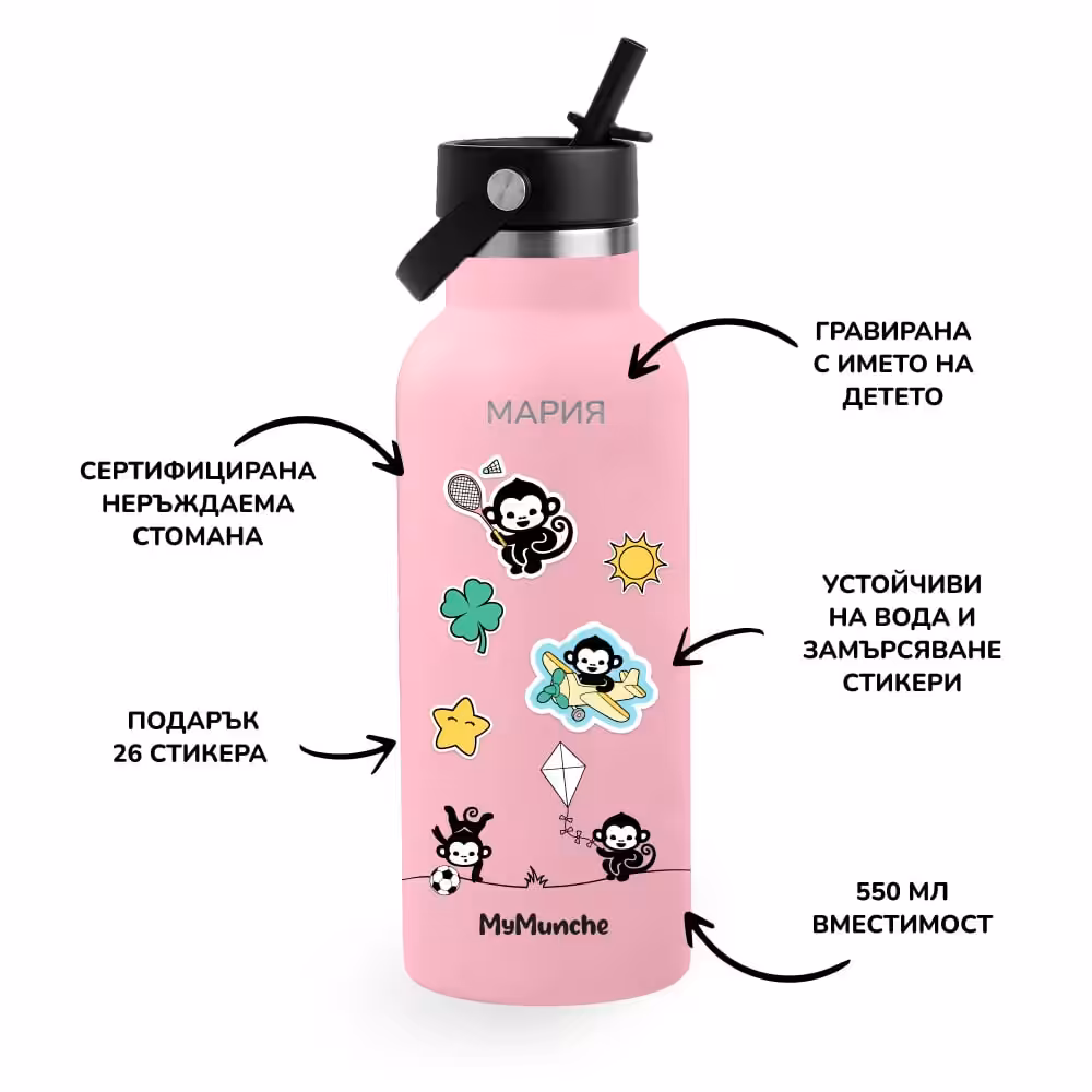 С вместимост 550 мл, двойна стена от неръждаема стомана и две сменящи се капачки, тя осигурява удобство и свежест без протичане. Силиконовият предпазител на дъното гарантира здравина при игра.